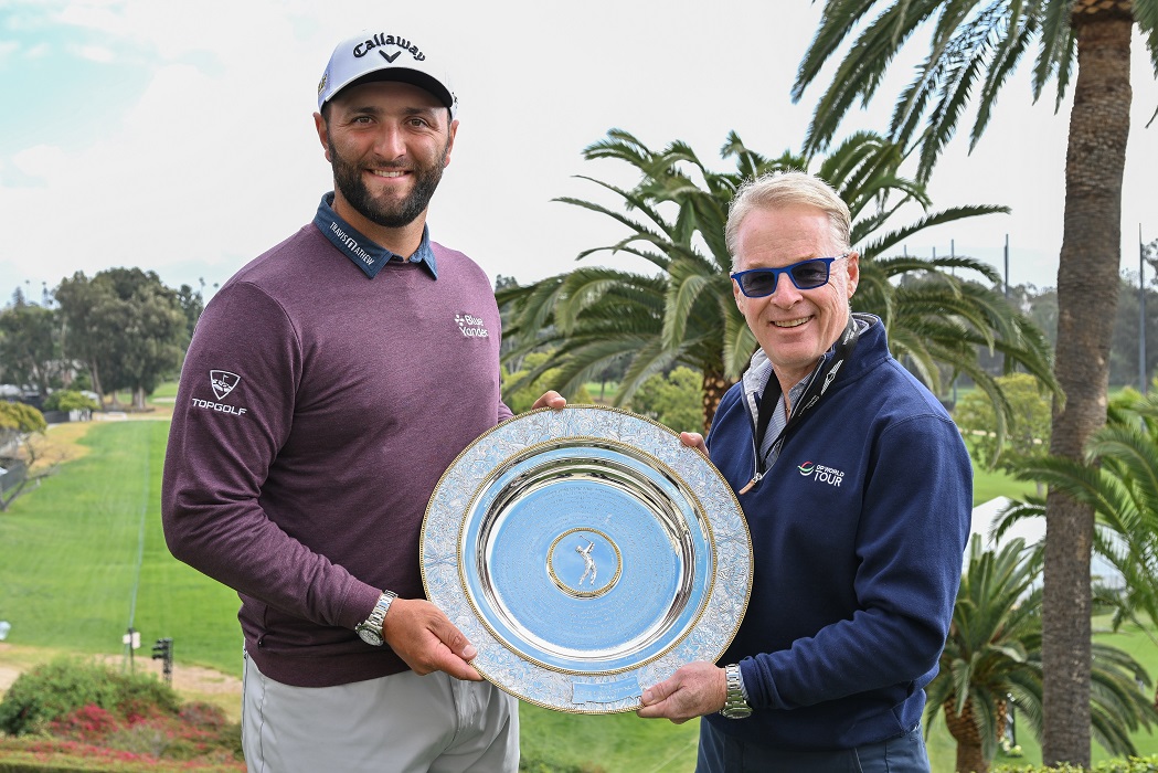 PACIFIC PALISADES, CA – FEBRUARY 15: Jon Rahm of Spain holds the trophy before the Genesis Invitational at Riviera Country Club on February 15, 2022 in Pacific Palisades, California. (Photo by Ben Jared/PGA TOUR)